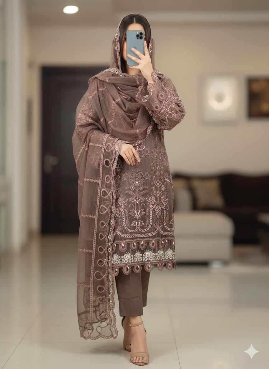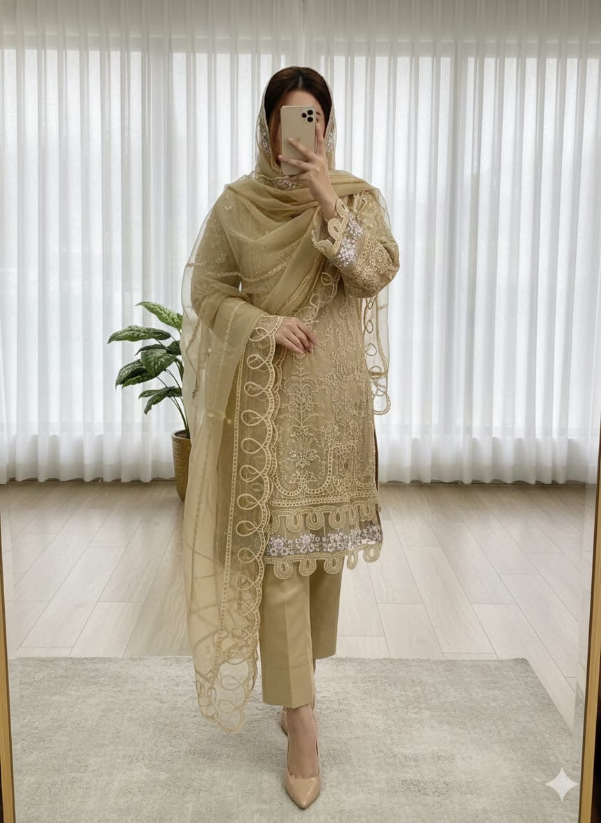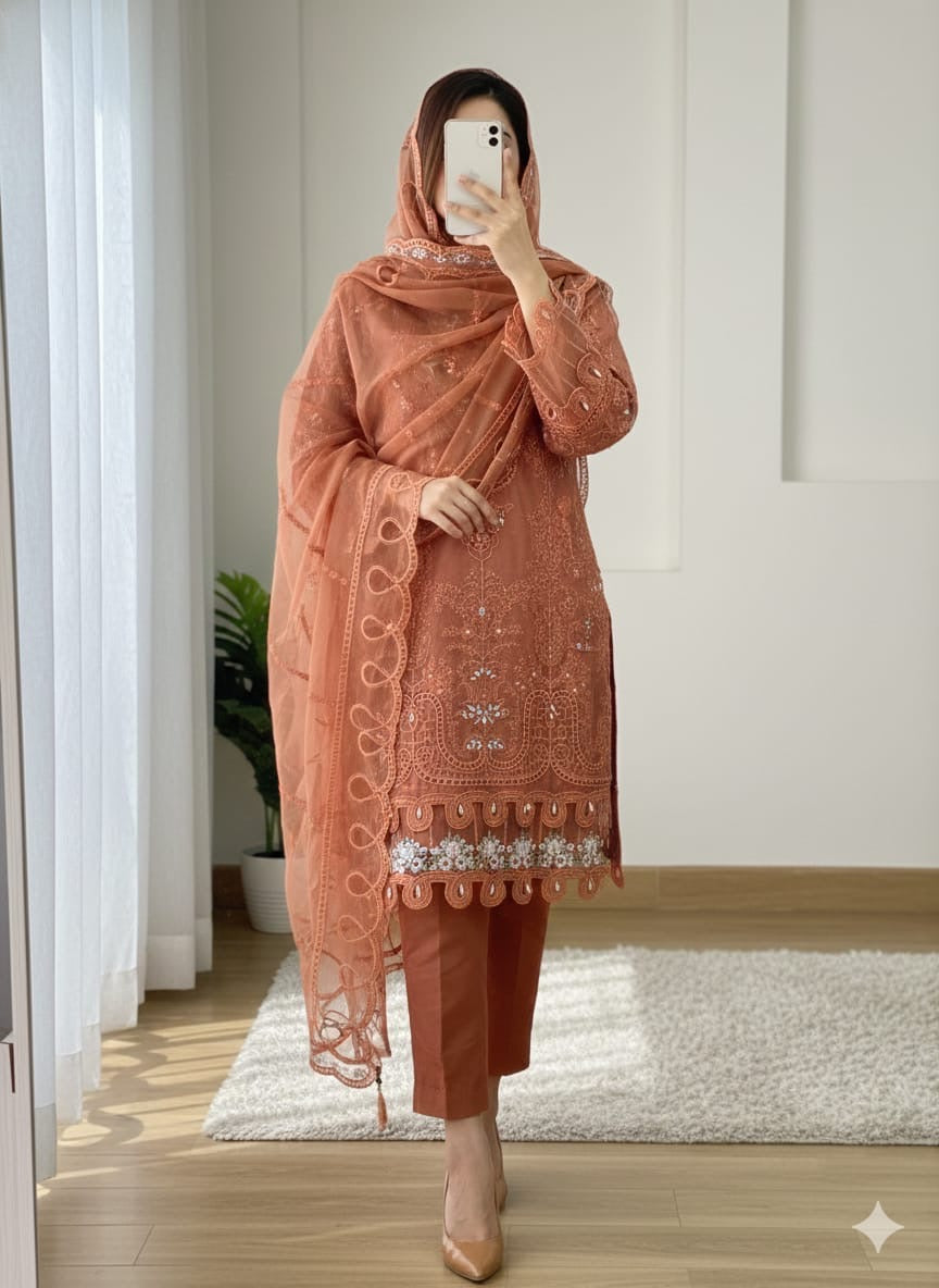 Organza Premium handwork embroidered pc with heavy cutwork latkans Glace cotton pants premiumOrganza Heavy cutwork full embroidered beautiful dupatta